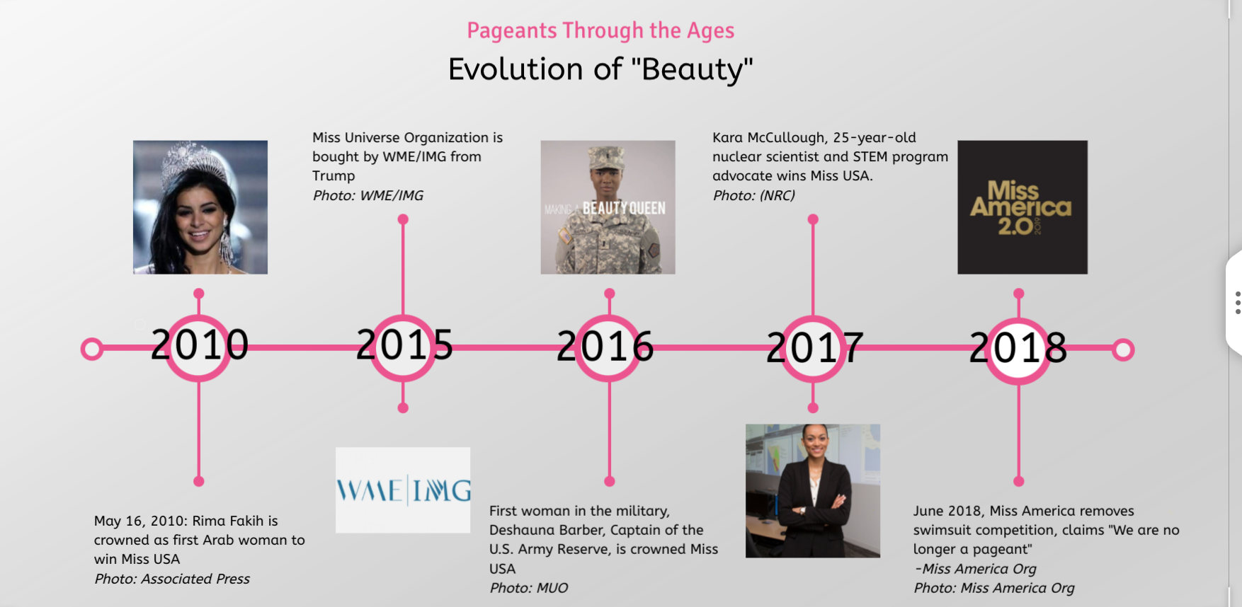 Diversity is increasing in the pageant world with women of all trades and educational backgrounds showcasing their scholarship. Thompson points out that many of the women who compete in pageants are accomplished scientists, lawyers, doctors, and teachers. “They just happen to be beautiful and have the ability to walk down a runway in 6-inch heels.” This diversity in careers was demonstrated in recent years of the Miss USA competition. Deshauna Barber, Miss USA 2016, was the first ever crowned captain in the U.S. Army Reserve. Her successor, Kara McCullough, Miss USA 2017, is a scientist at the Nuclear Regulatory Commission. And just last December, Miss America 2020, Camille Schrier won the national pageant with a chemical reaction science experiment demonstration as her talent. Not only have these women brought diversity to the goals and career paths of the women in pageants, but they have contributed to exterior diversity as well.